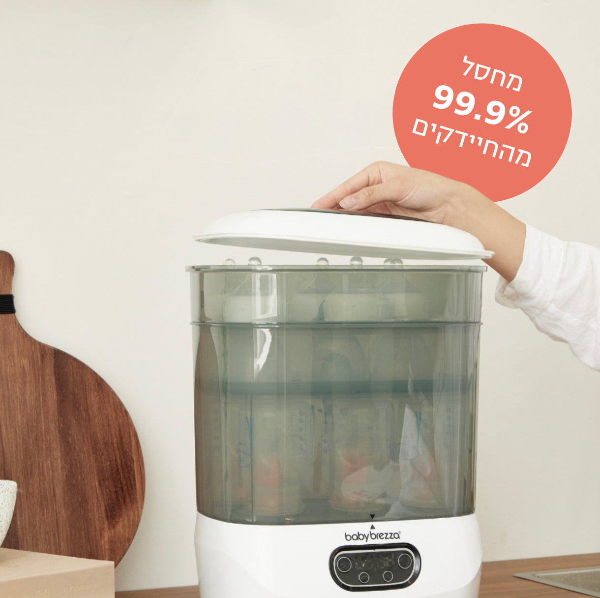 בלחיצת כפתור המכשיר יבצע סטריליזציה וייבוש באופן אוטומטי לבקבוקים, חלקי משאבה ואביזרים אחרים עם אידוי טבעי