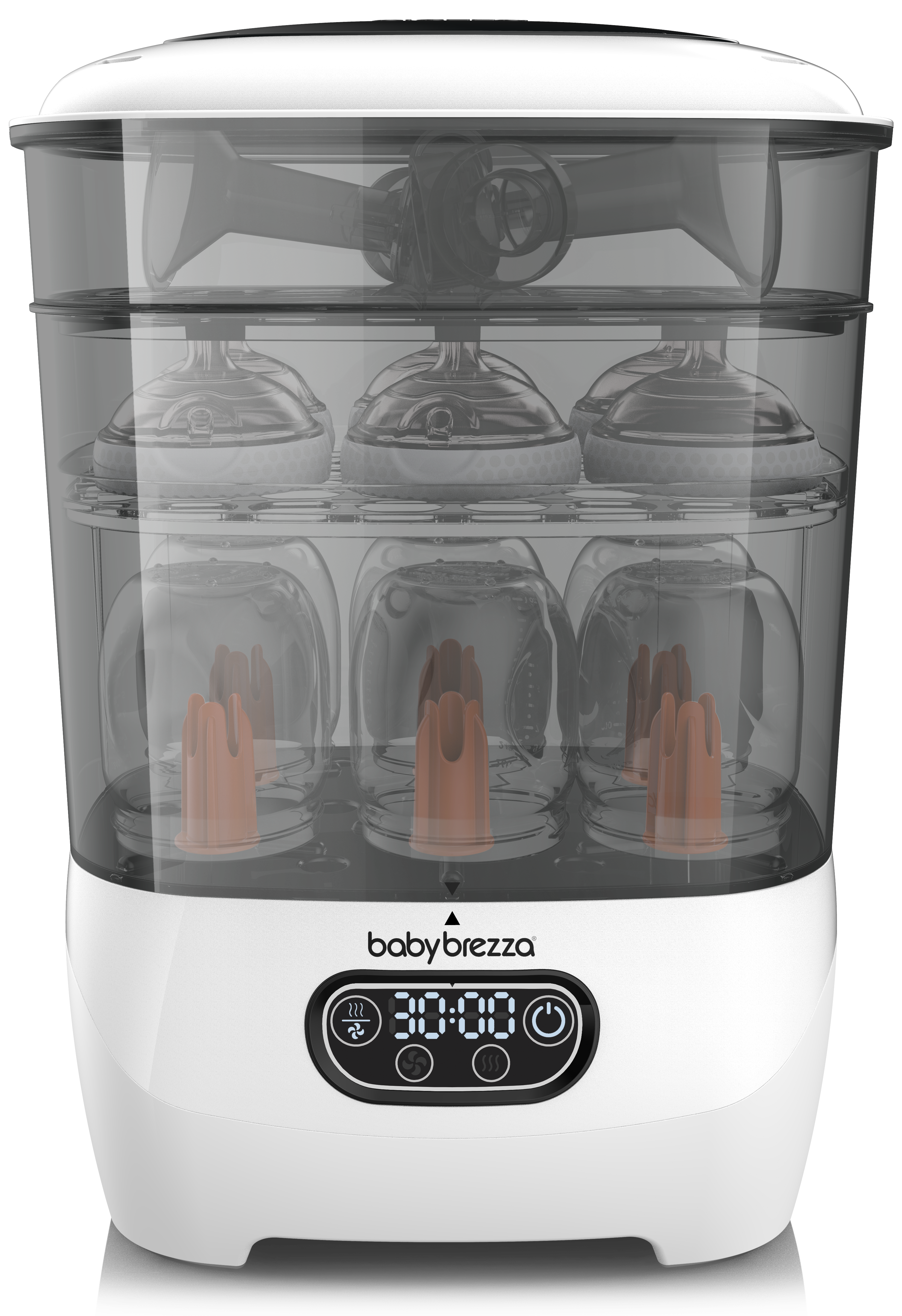 בלחיצת כפתור המכשיר יבצע סטריליזציה וייבוש באופן אוטומטי לבקבוקים, חלקי משאבה ואביזרים אחרים עם אידוי טבעי